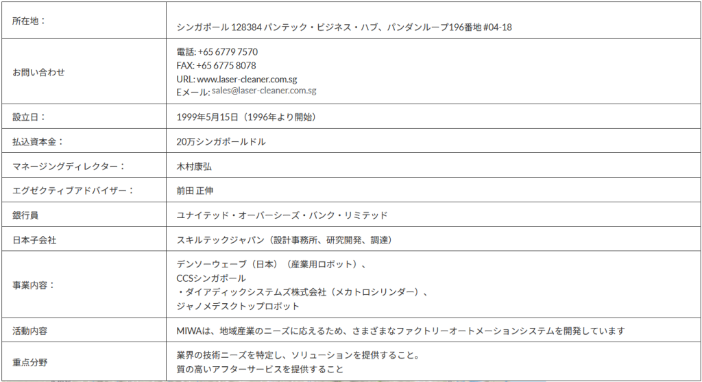 会社概要(MIWA Techno(S) Pte.,Ltd.)